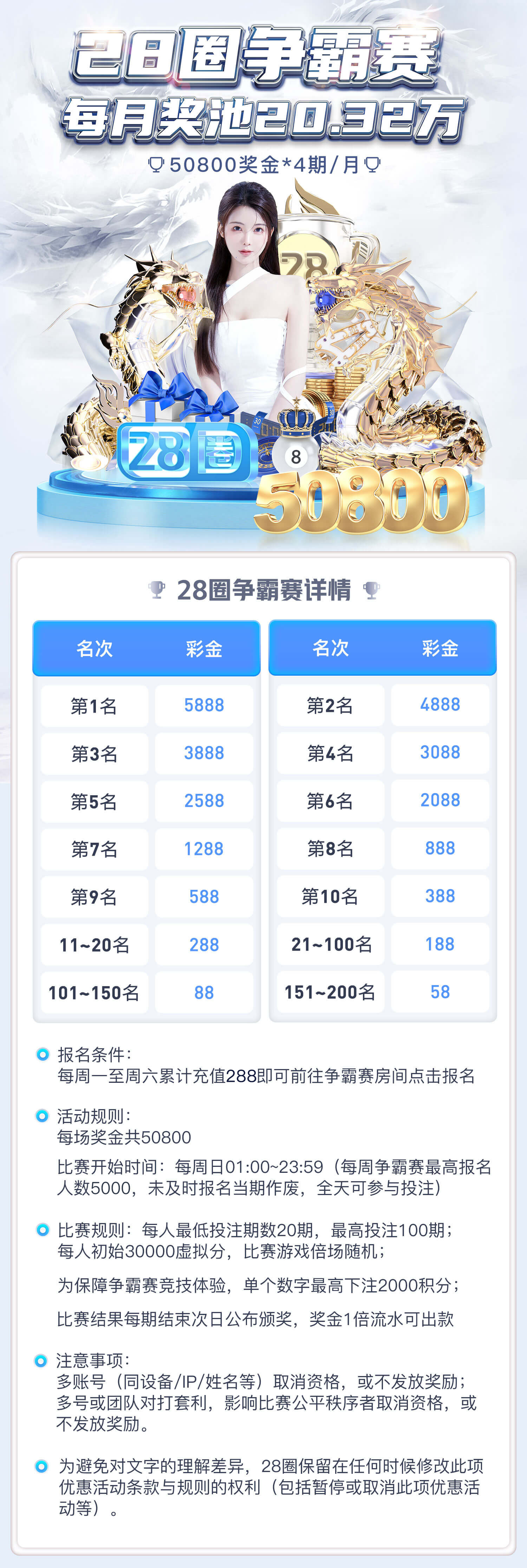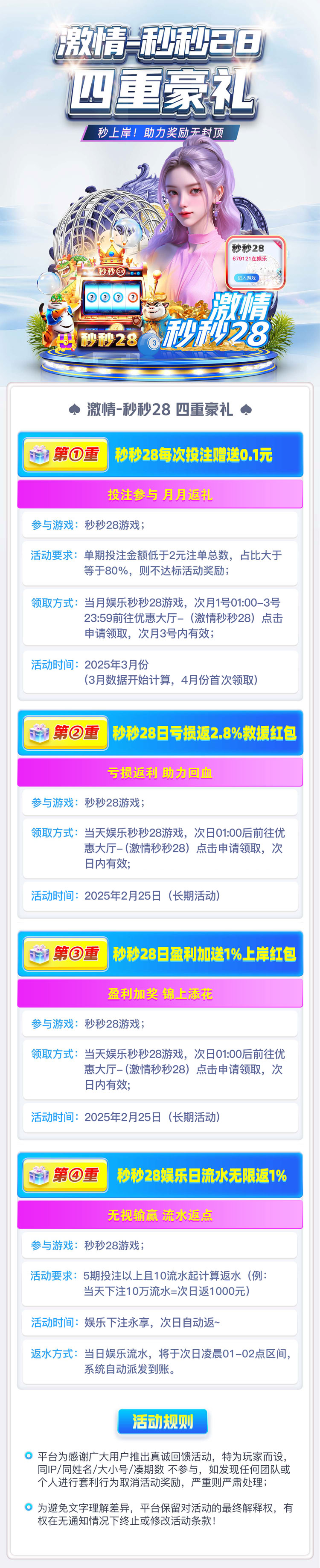 覆盖全网各种官方彩种,权威彩票,提供大小单双、组合、数字、龙虎等多元竞 猜。平均日500期开奖,28圈致力为玩家打造高品质的娱乐环境,安心乐享游 戏空间,只为公平、公正的开奖结果。